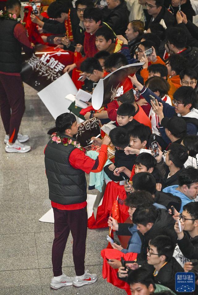 ↑中国队球员在机场与接机球迷互动。新华社记者李明摄