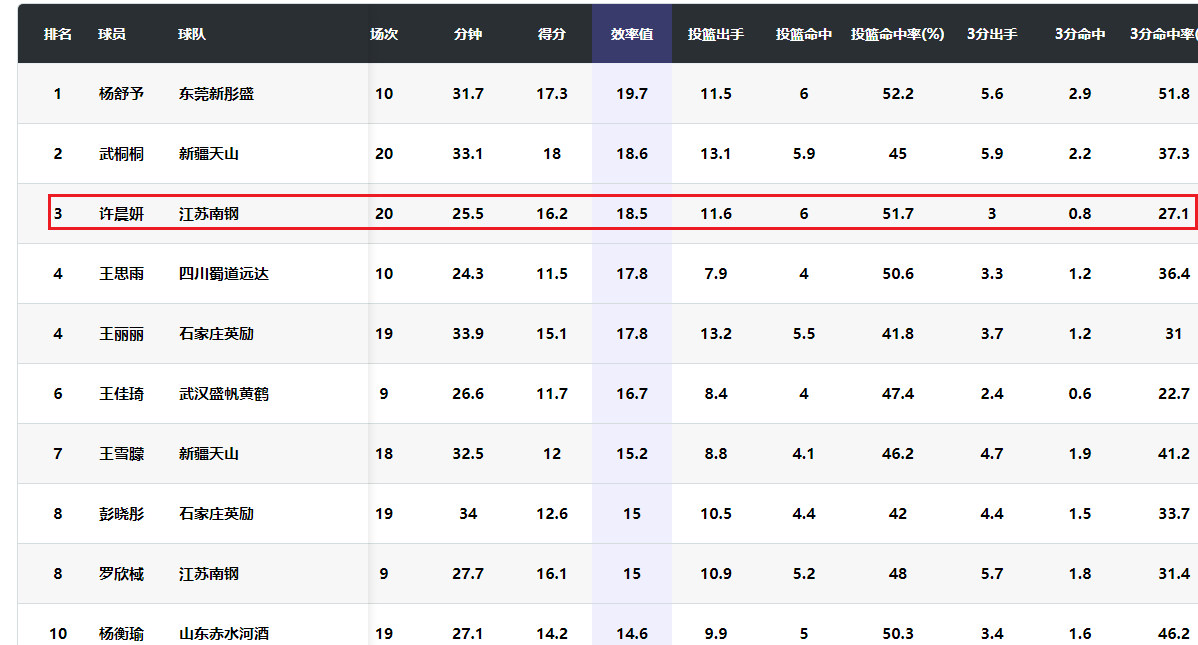 在本土球员篮板榜上,许晨妍以场均抢到6.9个篮板排名第一。在本土球员效率值榜上,杨舒予以19.7排名第一,武桐桐18.6位居第二,许晨妍18.5排名第三,王思雨和王丽丽都是17.8并列第四。很显然,许晨妍是本赛季效率值最高的中锋。相比之下,陈明伶效率值13.7排名本土球员第14位。刘禹彤效率值13.2排名本土球员第16位。